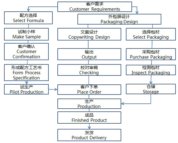 配方研發(fā)、包材原料采購、VI設(shè)計、產(chǎn)品灌裝、產(chǎn)品送檢、三證提供的全過程。