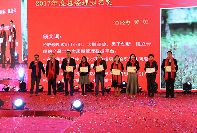 正如唐董所言,2017是不平凡的一年!過去的一年,公司除成功達(dá)成重大項(xiàng)目之外,還涌現(xiàn)了大批優(yōu)秀的團(tuán)隊(duì)、個(gè)人。為感謝他們在各自崗位上付諸的努力,公司依次頒發(fā)了優(yōu)秀項(xiàng)目獎(jiǎng)、優(yōu)秀團(tuán)隊(duì)獎(jiǎng)、明日之星獎(jiǎng)、棟方風(fēng)范獎(jiǎng)、總經(jīng)理提名獎(jiǎng)、十年忠誠獎(jiǎng)等十三個(gè)獎(jiǎng)項(xiàng),共計(jì)4大項(xiàng)目、5個(gè)團(tuán)隊(duì)與137名個(gè)人在此次年會(huì)上受到表彰。